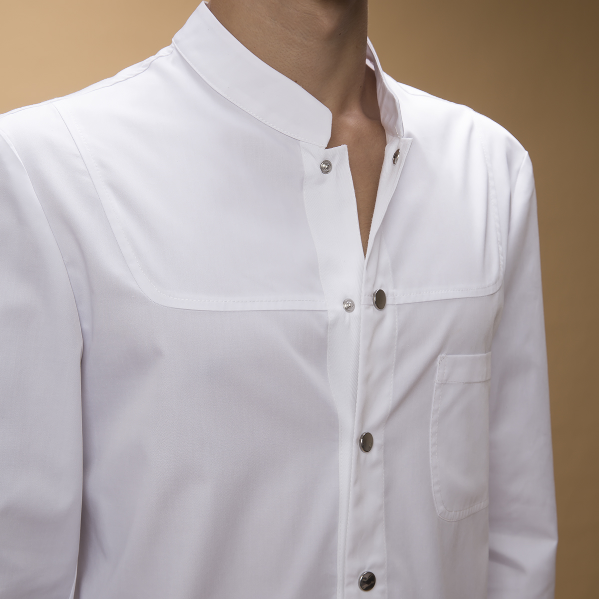 Men’s regular fitted lab button-up lab coat with long sleeves and rib trims. Features three front pockets, mao collar, a flap that fastens with metal trunks.