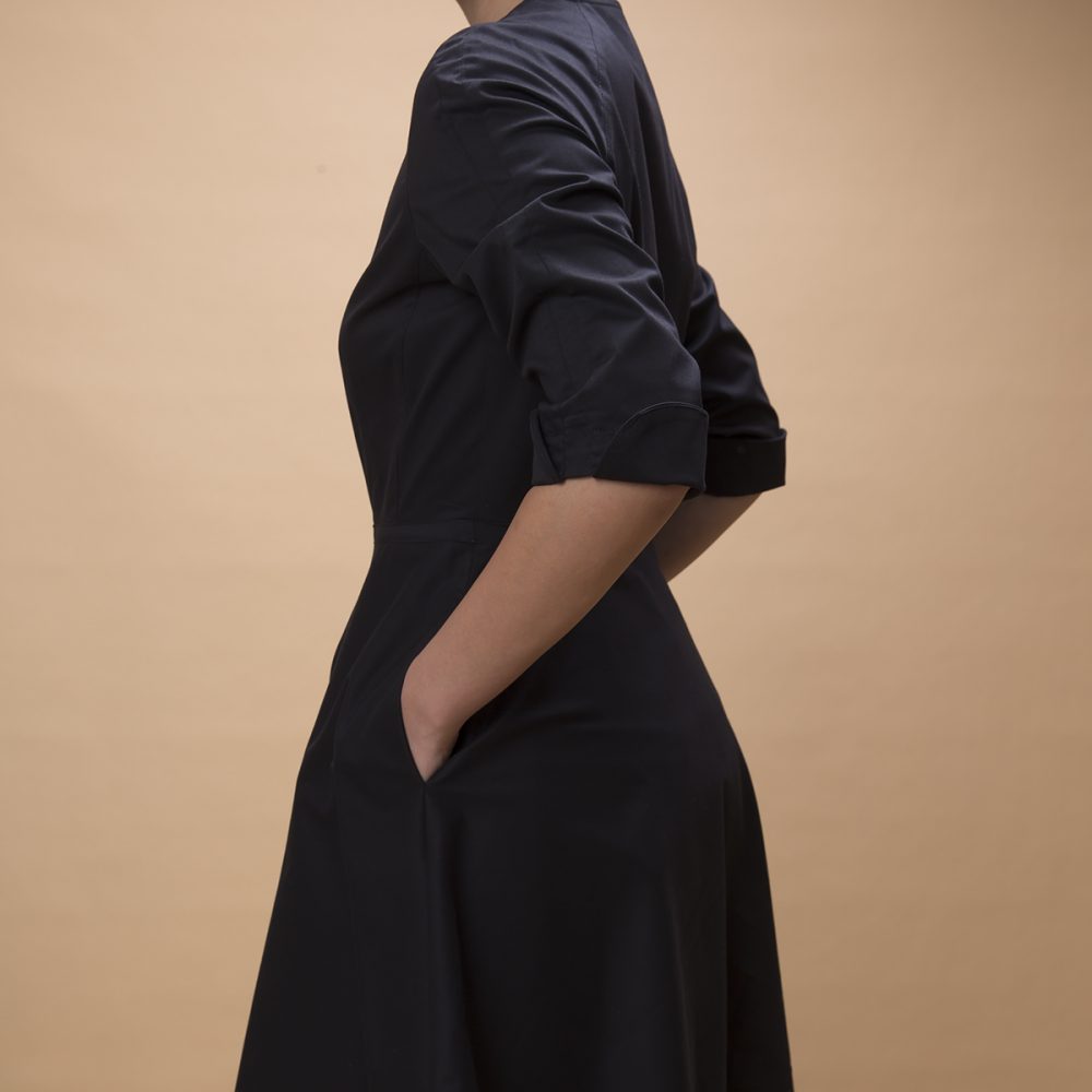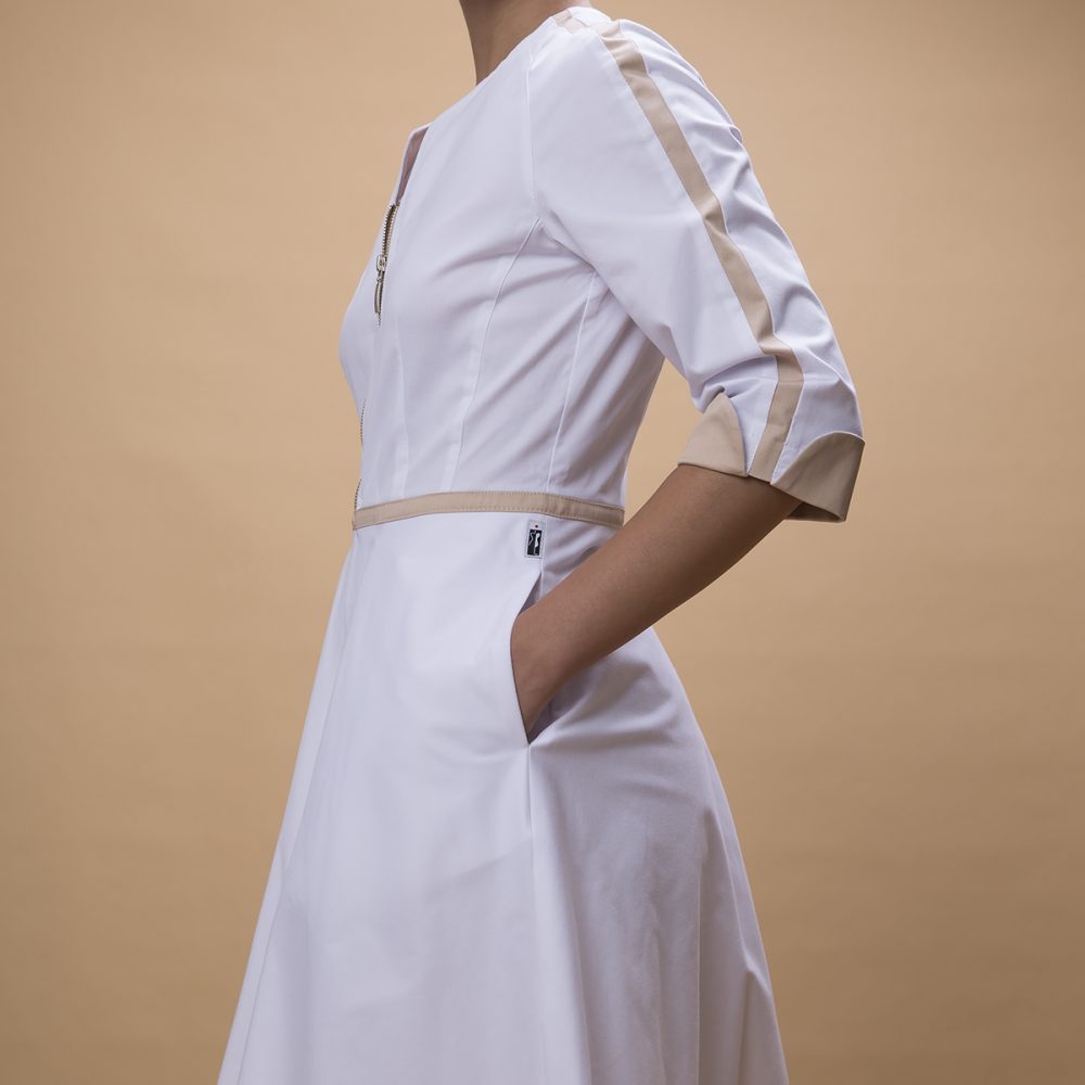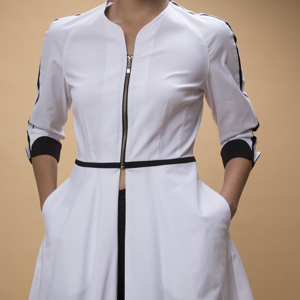 Women’s lab coat, slim fitted at the top and cloche at the bottom. It has Reglan sleeves (3/4), a zipper that stops in the middle and two comfortable hidden pockets on the side. Possibility to choose in different colors in the apron and the façade.