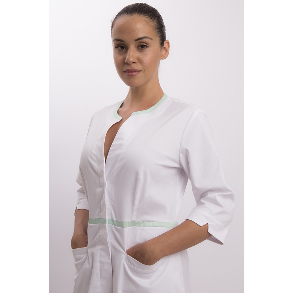 Γυναικεία ποδιά σε στενή γραμμή με 3/4 μανίκια. Κρυφή πατιλέτα με κουμπιά. Δύο άνετες τσέπες φιλέτο, χρωματιστή διακοσμητική φάσα στην λαιμουδιά και στην μέση.