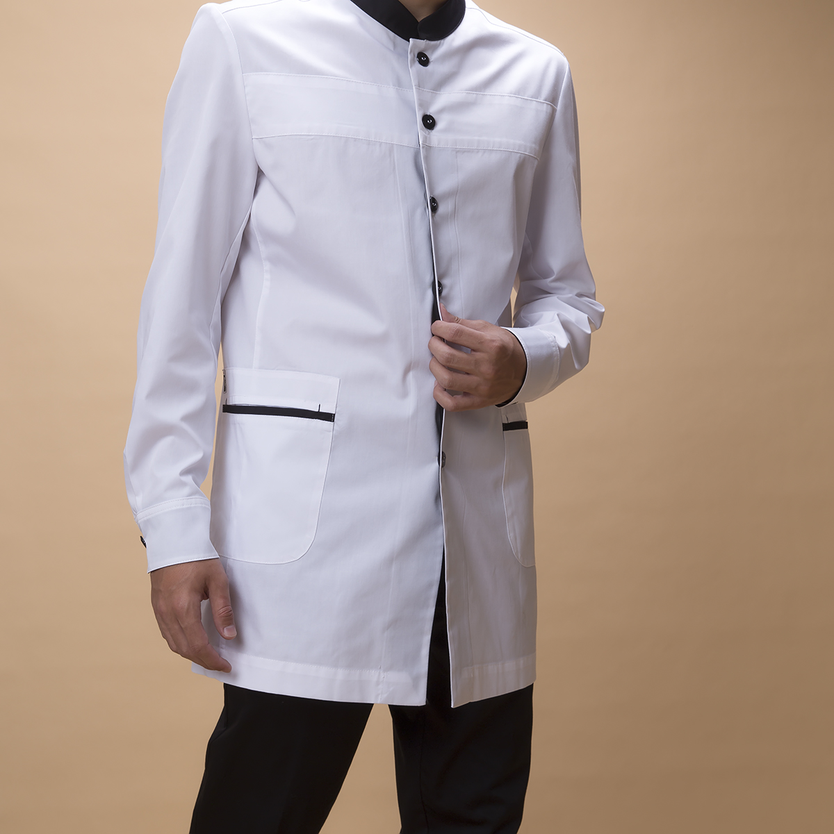 Ανδρική ποδιά σε άνετη γραμμή με μακριά μανίκια. Δύο εξωτερικές τσέπες, γιακάς Μάο.