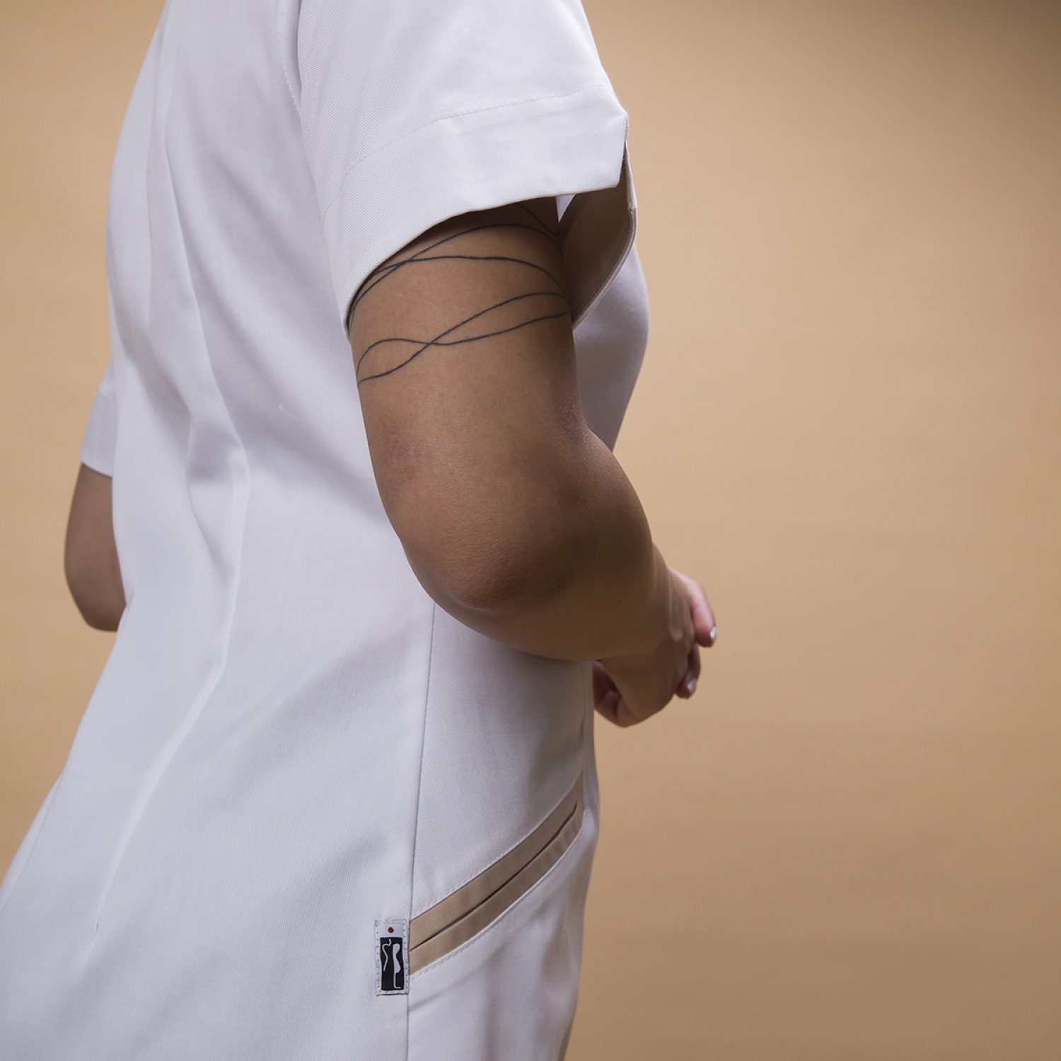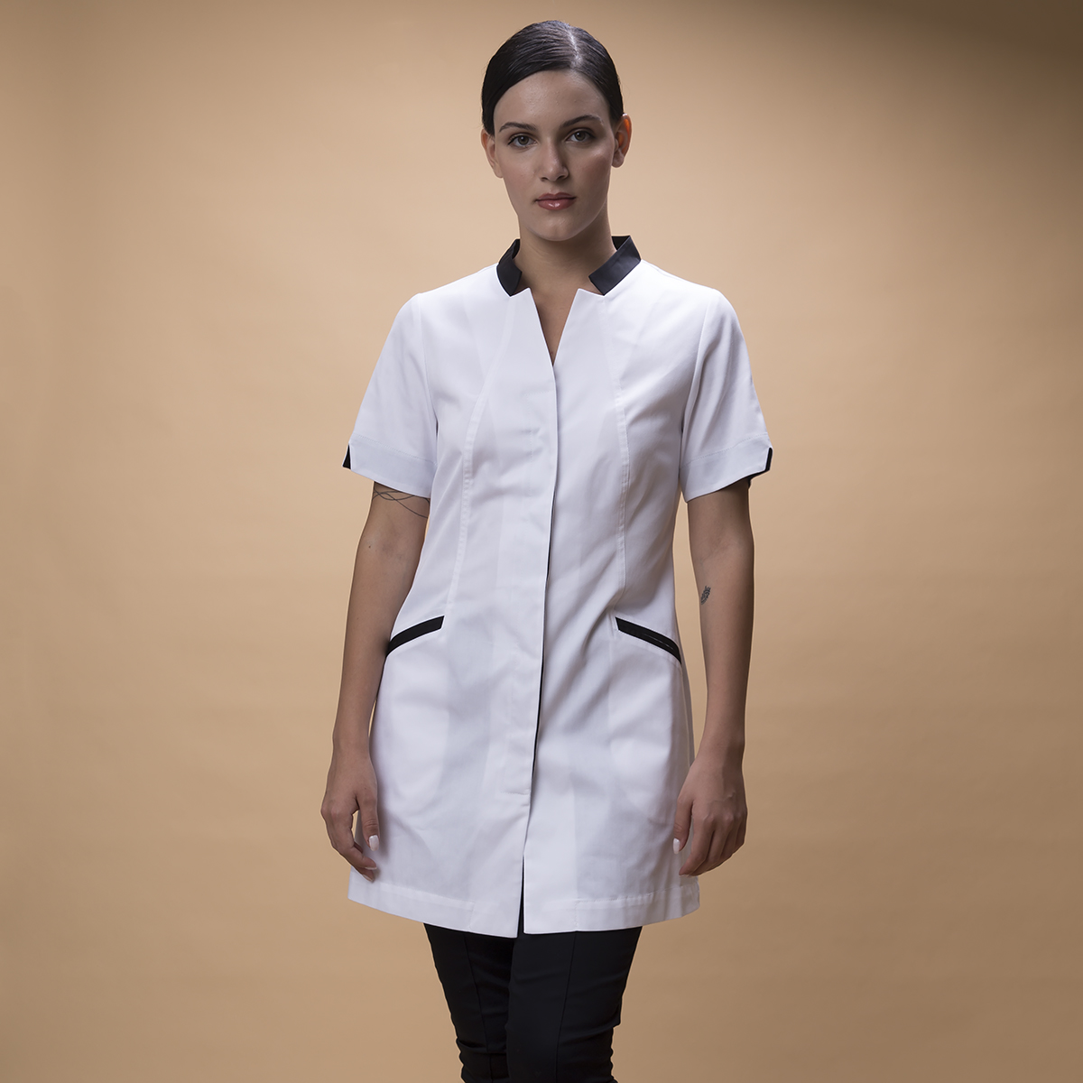 Γυναικεία ποδιά σε στενή γραμμή με κοντά μανίκια. Ιδιαίτερος γιακάς, κρυφή πατιλέτα με κουμπιά, δυο άνετες μπροστινές τσέπες.