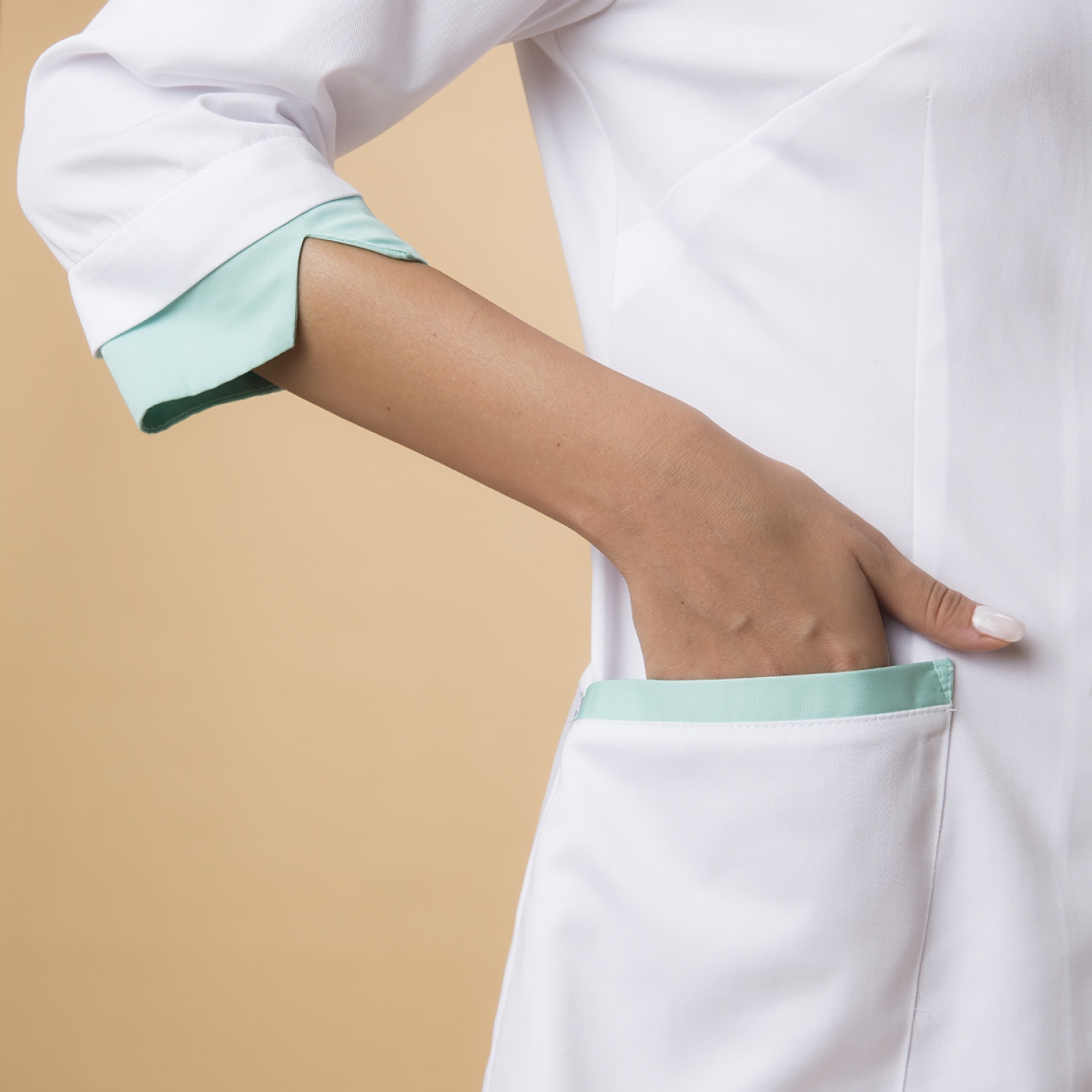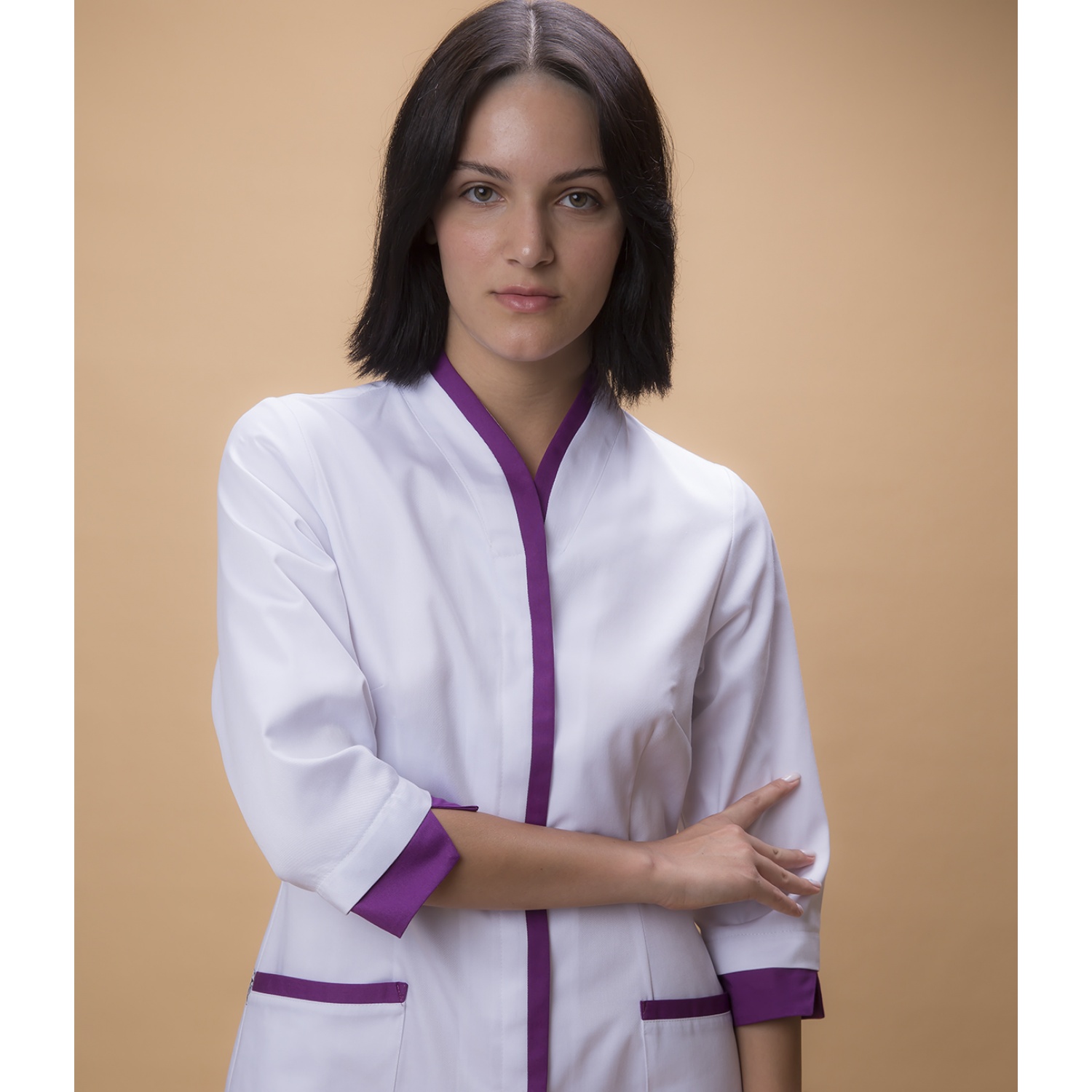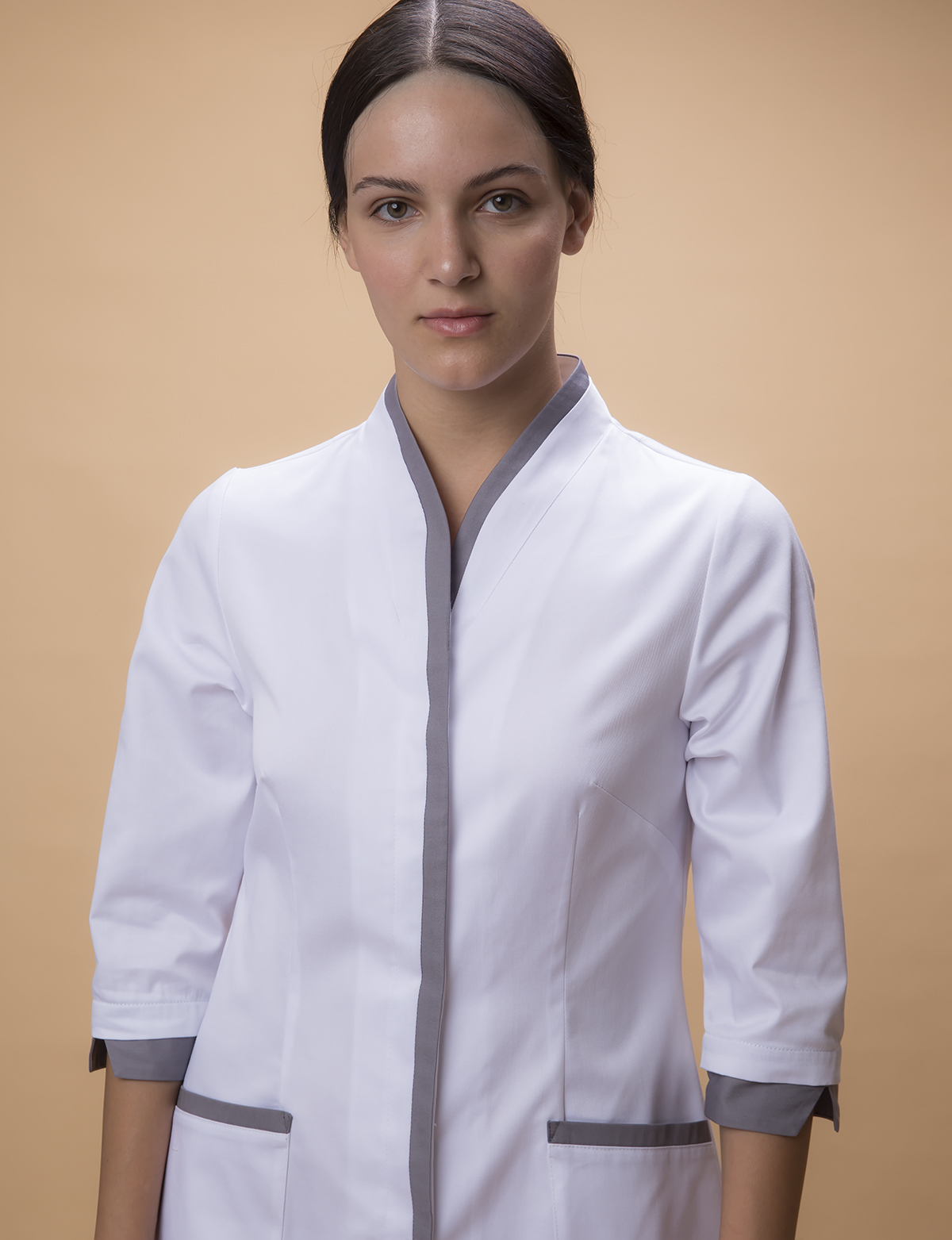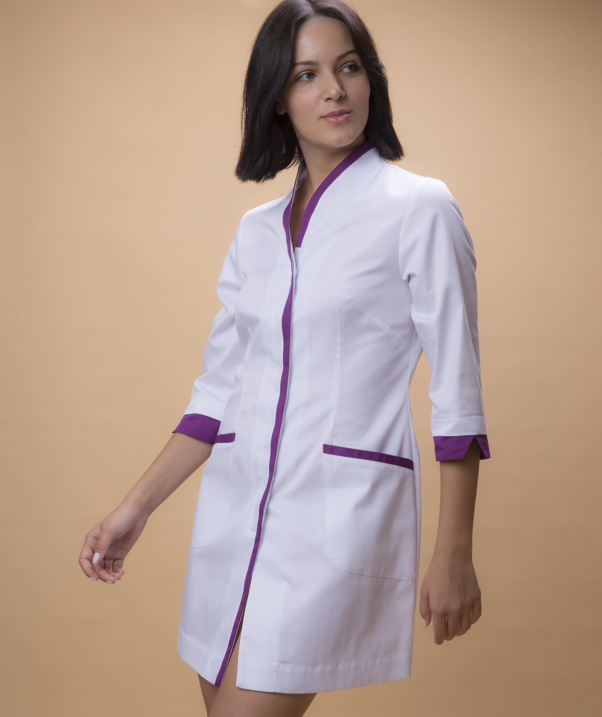 Γυναικεία ποδιά σε στενή γραμμή με 3/4 μανίκια. Ιδιαίτερος γιακάς, κρυφή πατιλέτα με κουμπιά, δυο άνετες μπροστινές τσέπες.