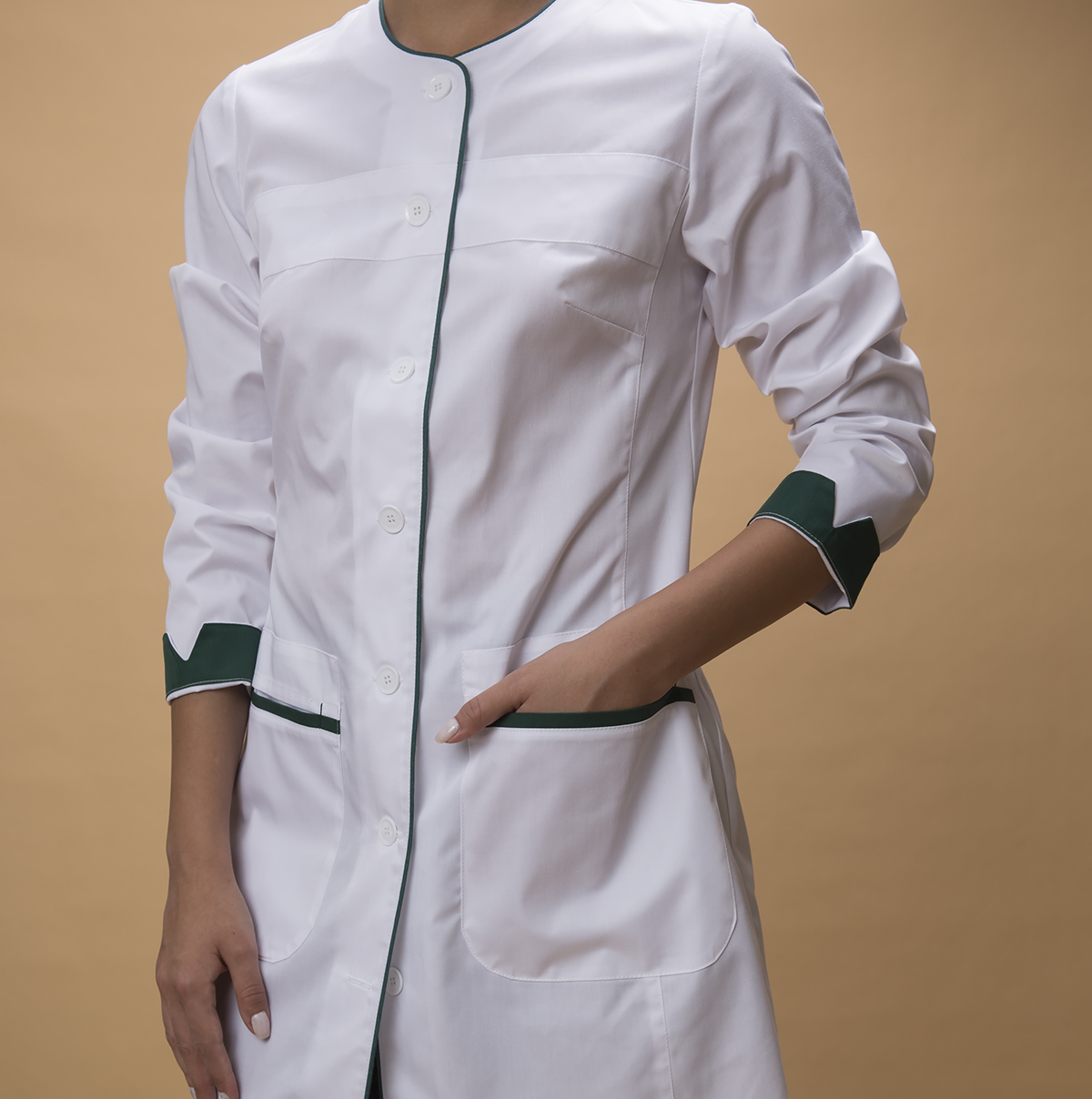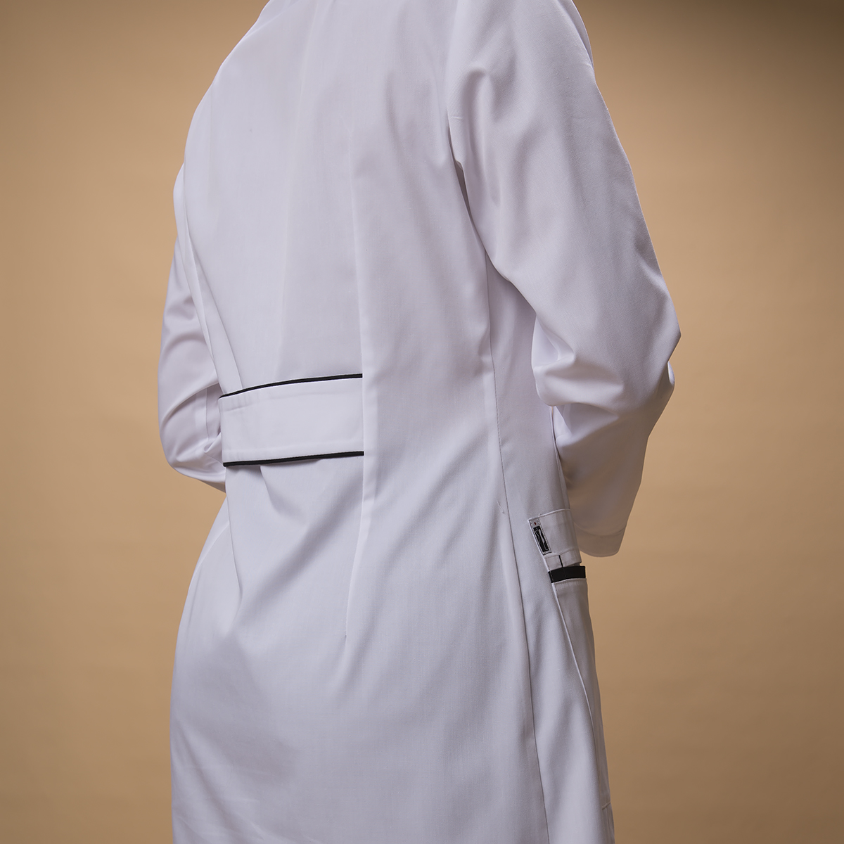 Γυναικεία ποδιά σε tailored γραμμή, με μακριά μανίκια. Με διακοσμητικό φυτίλι κατά μήκος της λαιμουδιάς και περιμετρικά των μανικιών. Έχει δυο ιδιαίτερες εξωτερικές τσέπες και διακοσμητικό ζωνάκι πίσω.