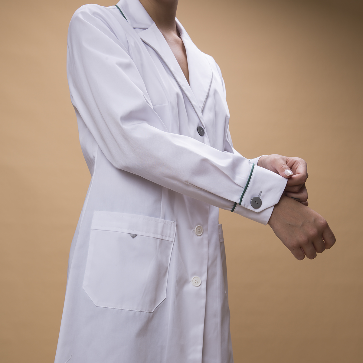 Γυναικεία ποδιά σε tailored γραμμή, με μακριά μανίκια. Έχει διακοσμητικό φυτίλι κατά μήκος του πέτου και δυο ιδιαίτερες εξωτερικές τσέπες.