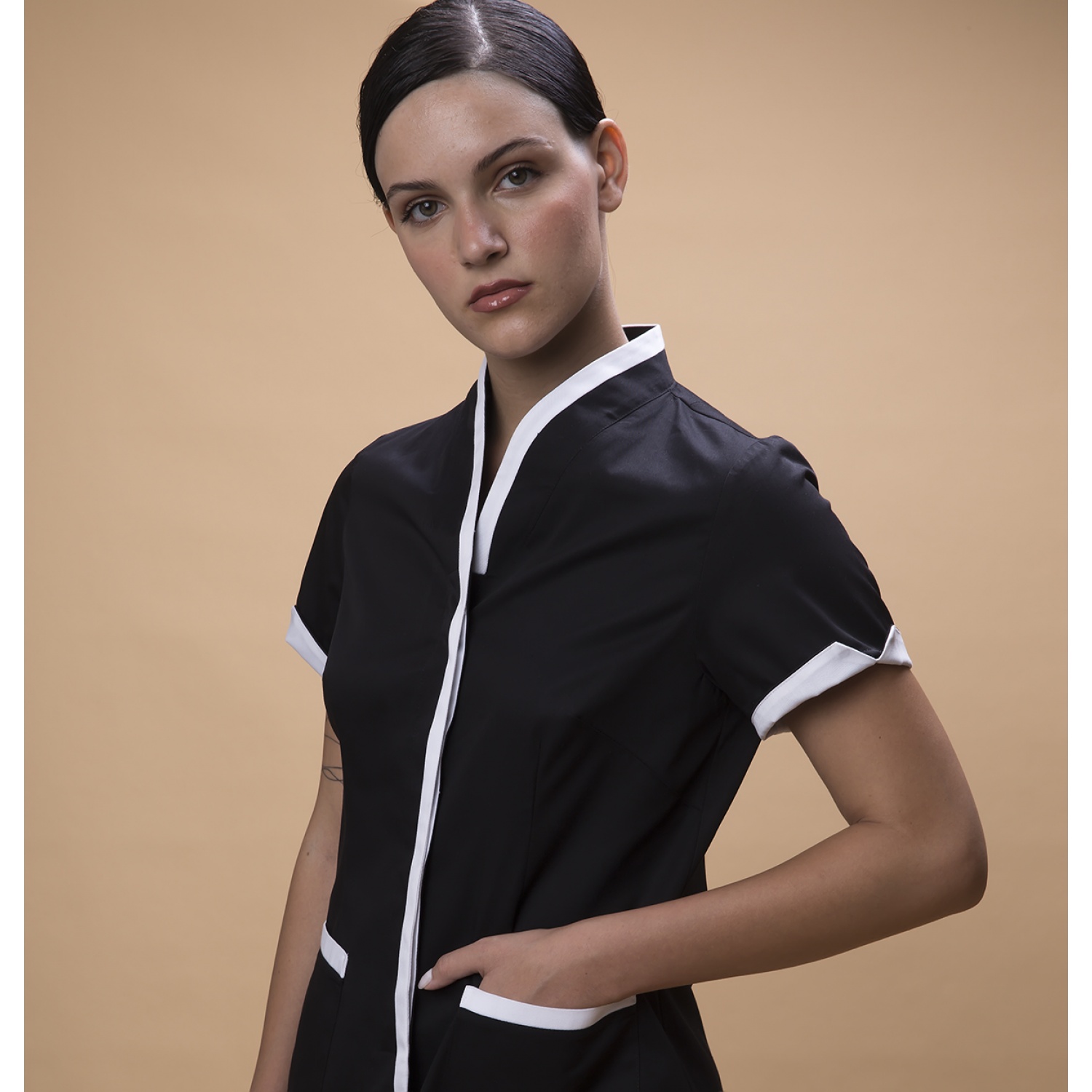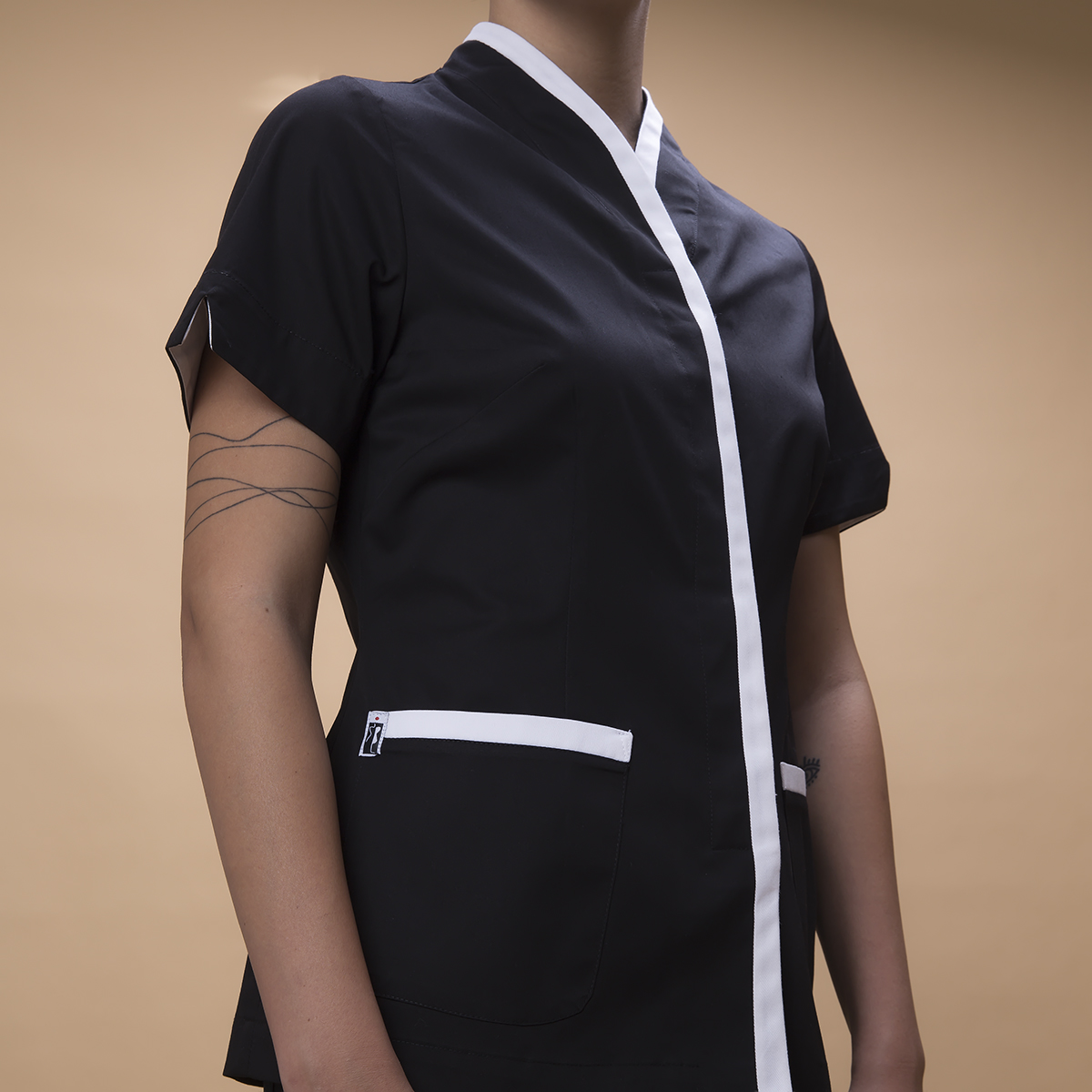 Γυναικείo τζάκετ σε στενή γραμμή με κοντά μανίκια. Ιδιαίτερος γιακάς, κρυφή πατιλέτα με κουμπιά, δυο άνετες μπροστινές τσέπες.