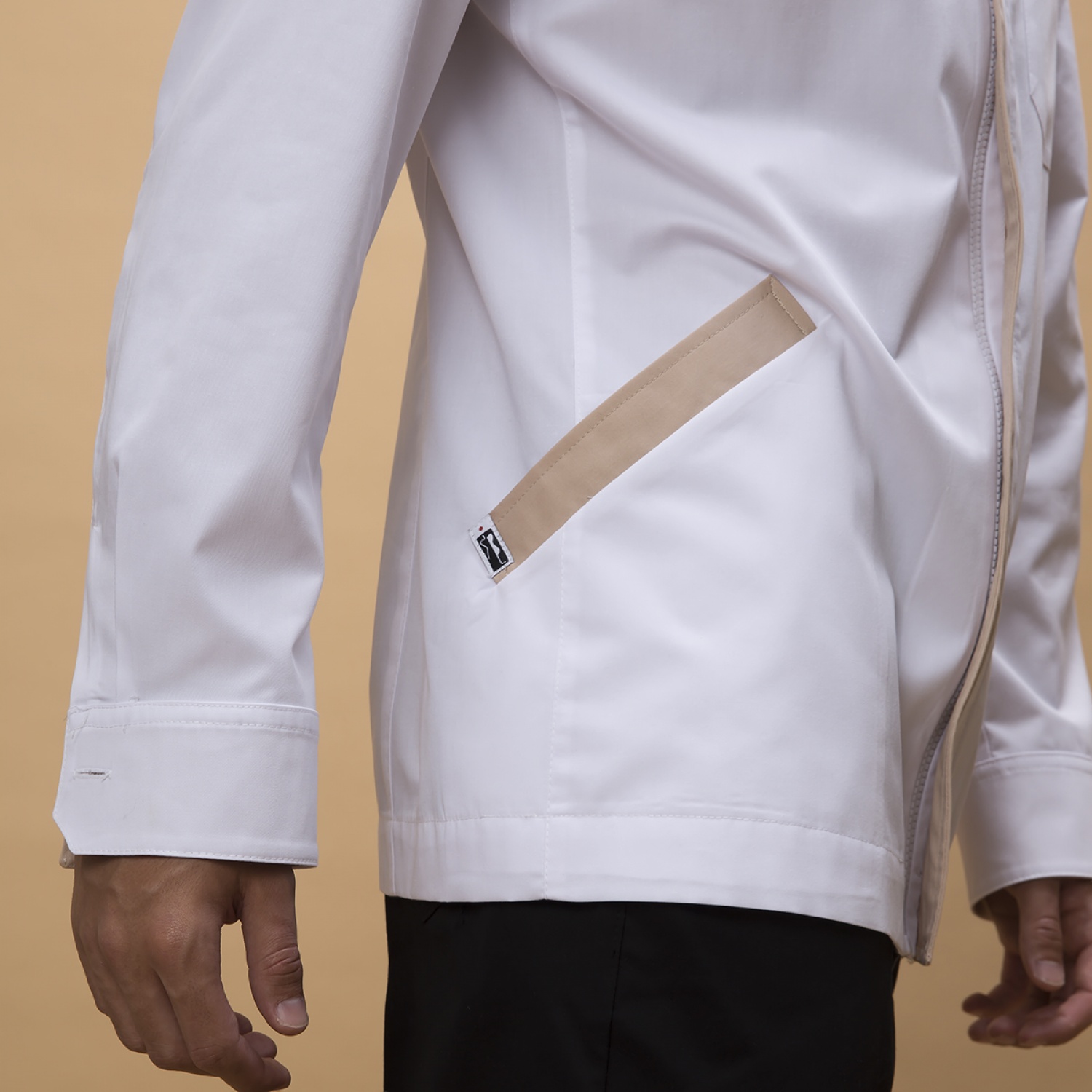 Ανδρικό τζάκετ σε tailored γραμμή με μακριά μανίκια. Τρείς εξωτερικές τσέπες, γιακάς Mάο με χρώμα, κούμπωμα με φερμουάρ καλυμμένο με πατιλέτα.